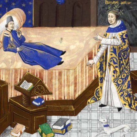 Pétrarque apparaît à Boccace (Boccace, De casibus virorum illustrium, 1467, Hunter372, f.65r) Voir la série
