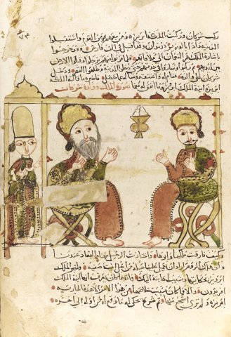 Le personnage au chapeau d'or assis à gauche sur un siège curule et flanqué d'un garde est le roi Umar an-Nu'mân. Il reçoit l'émissaire du Basileus de Constantinople, qui lui demande une aide militaire contre le roi de Césarée, qu'il accuse de félonie. Le siège de l'émissaire n'est pas un siège curule, qui est le siège du commandement, et sa coiffe est plus simple.
