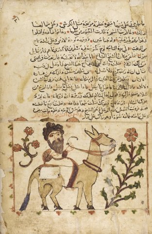 La miniature représente l'apparition du vieillard sur sa monture mystérieuse, avant qu'il n'invite Abu-Hasan à monter en croupe derriÚre lui.