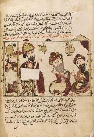 Le roi, représenté à gauche assis sur un siège et flanqué d'un garde, reçoit le vieillard, reconnaissable à sa barbe grise, et Abu Hasan, plus jeune avec de fines moustaches, dans son palais à Bagdad. Le roi demande à Abu-Hasan pourquoi son frère Al-Sindi n'est pas présent.