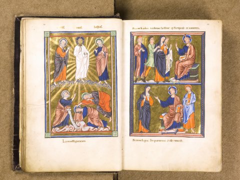 Lower miniature: "Mulier, ubi sunt qui te accusabant" (Woman, where are your accusers?" The woman replies, "Nemo, domine".