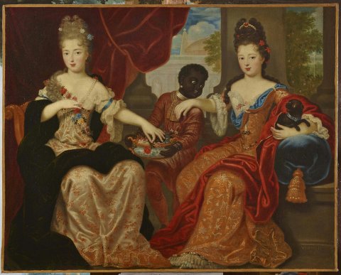To the left, Francoise-Marie de Bourbon (1677-1749), Duchesse d'Orléans, second Mademoiselle de Blois, and to the right, her sister Louise-Francoise de Bourbon (1673-1743), Duchesse de Bourbon, Mademoiselle de Nantes, daughters of King Louis XIV of France and the Marquise de Montespan. They are served by a black slave, who, like the dog, wears the collar of servitude.