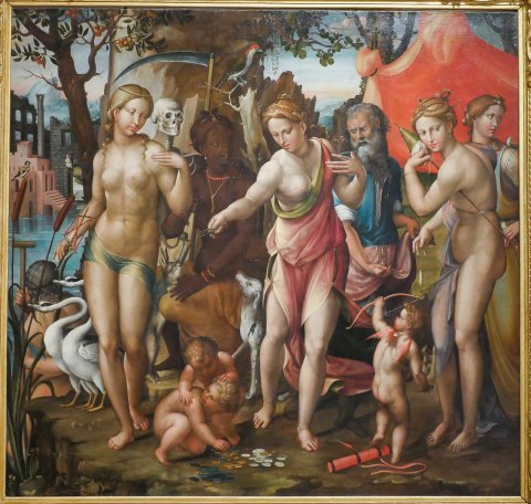 3. Bigio ne peut pas s'inspirer ici de la description du palais des Parques à la fin du chant 34 du Roland furieux de l'Arioste : pour l'Arioste, les Parques sont de vieilles femmes et les vies sont matérialisées par des pelotons ; enfin, sur le tableau de Bigio, point de palais.
