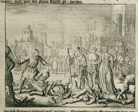 Félicité tuée avec ses 7 fils, Rome, 104 (Luyken, Théâtre des Martyrs)