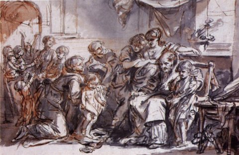 2. E. Munhall date cette gouache de 1793 par comparaison avec une autre scène de famille avec un vieillard donnant sa bénédiction, que Greuze avait signée « Donné à Lebrun par son ami Greuze le 6 7[?]bre 1793 ».