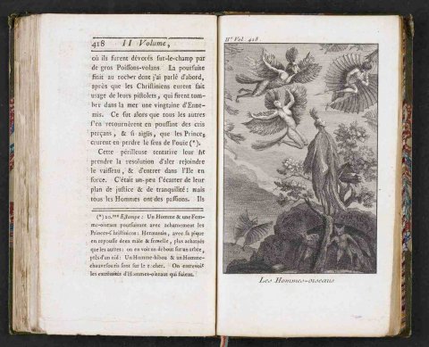 « Ils virent autour d’eux des espèces d’hommes, qui n’avaient que le buste, et tout entourés d’une pellicule qui leur servait d’ailes, au moyen desquelles ils volaient avec la plus grande rapidité. Ils les écartèrent facilement avec une sorte de pique, dont ils s’étaient munis pour la première fois, ces hommes-chauves-souris n’ayant aucun membre dont ils pussent se servir, que leur bouche avec laquelle ils happaient de gros scarabées [...], des hannetons, etc., en quoi consistait leur nourriture. Rassurés par la timidité de leurs ennemis, les trois princes avancèrent dans l’intérieur de l’île mais sans mettre pied à terre. Ils parvinrent à une montagne, dans les antres de laquelle ils entendirent des cris désagréables, qui ressemblaient fort au cri du chat-huant, mais beaucoup plus nourris. A l’instant où ils abordèrent sur la montagne, ils virent s’élever de gros oiseaux, qui avaient des plumes, une tête d’homme, avec un nez de chat, et un espèce de bec fort court, qui se mirent en devoir de les attaquer. Mais les princes les effrayèrent par quelques coups de pistolets qui, en ayant renversé plusieurs, mirent tous ces hommes- chats-huants en fuite. Hermantin et ses compagnons, débarrassés de ces ennemis, s’abattirent dans la plaine, et tâchèrent de trouver des habitations. Ils n’en virent aucune, mais s’étant élevés au-dessus d’un bois, tout composé de gros arbres qui paraissaient élagués et éclaircis par art, ils trouvèrent sur chacun de ces arbres une espèce de nid, composé de branchages assez forts, et recouverts d’une calotte de terre pétrie avec de la mousse, à peu près dans la forme des nids de pie ou de corbeau. Ils visitèrent cette ville d’une nouvelle espèce, dont toutes les maisons étaient exactement fermées, n’ayant qu’une ouverture par en haut pour donner passage à l’air. [...] Elles étaient assises sur le haut de la tige de l’arbre, et leurs appuis étaient entrelacés avec beaucoup d’art dans les plus grosses branches. Tous ces arbres étaient fruitiers, et portaient une espèce de châtaigne qui était alors à maturité : ce qui marquait de l’intelligence dans ces habitants, quels qu’ils fussent. [...] Ces peuples se couchaient de bonne heure, comme tout ce qui tient à la gent volatile, et se levaient très matin. A peine l’aurore indiquait-elle la renaissance du jour, que les sauvages-ailés ouvrirent la porte de leurs nids, dont ils sortirent en foule avec des cris fort aigus. [...] Il n’y avait pas moyen de fuir, les ennemis assaillaient de tous côtés ; il ne restait d’autre route que celle des régions supérieures et froides : les six princes s’élevèrent autant qu’il leur fut possible de supporter la privation de chaleur et, de là, ils se défendirent avec leurs longues piques contre les hommes-oiseaux, qui s’élevaient en caracolant jusqu’à eux et redescendaient aussitôt, après avoir tâché de porter un coup de la pointe de leur nez osseux et crochu, ou d’une épine assez longue qu’ils tenaient à la main. Les Christiniens en blessèrent plusieurs, surtout un mâle et une femelle fort acharnés. Il y en eut cependant qui ne prirent aucune part à ce combat, qui effraya les hommes-hibous et chauves-souris au point de les faire sortir de leurs retraites. Cependant les princes s’éloignaient de l’île, en combattant toujours ; ils étaient si vivement poursuivis que plusieurs des ennemis blessés tombèrent dans la mer, où ils furent dévorés sur-le-champ par de gros poissons-volants. La poursuite finit au rocher [...], après que les Christiniens eurent fait usage de leurs pistolets, qui firent tomber dans la mer une vingtaine d’ennemis. Ce fut alors que tous les autres s’en retournèrent en poussant des cris perçants et si aigus que les princes crurent en perdre le sens de l’ouïe*. »