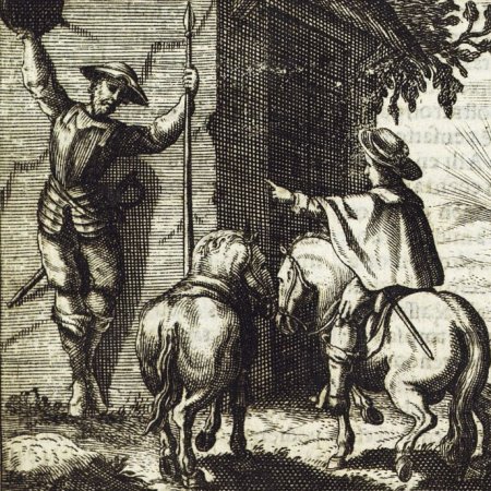 Légende sous la gravure : « Don Quichotte attaché à une Fenestre par la malice de Maritorne. Tom. 2. Ch. 39. »