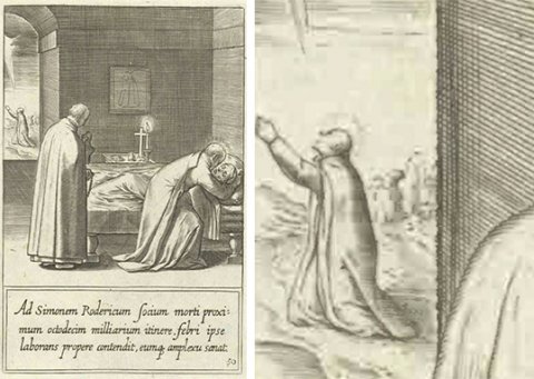1. Légende : « Ad Simonem Rodericum socium morti proximum octodecim milliarium itinere febri ipse laborans propere contendit, eumque amplexu sanat. »