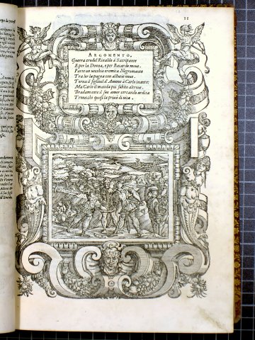 Les éléments de la narration ne suivent pas une progression continue dans l’image, mais son disposés tout autour d’un épisode privilégié, l’intervention du valet de l’ermite pour séparer Renaud et Sacripant. Le valet n’assiste pas au combat, ne regarde pas une scène. Son geste et sa parole séparent efficacement les combattants (A opposer à la gravure de l’édition Zatta). La logique performative est encore ici la logique fondamentale de la représentation. Tout autour de la performance, l’espace éclate en territoires narratifs.