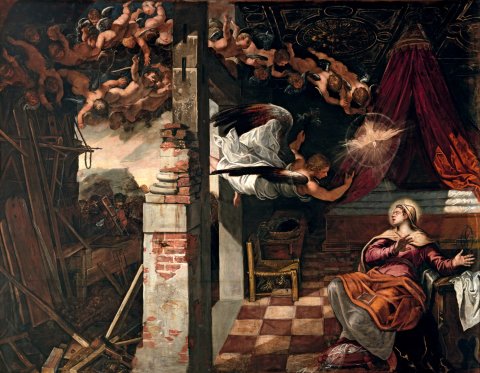 Pourquoi ce contraste entre les deux parties du décor ? L’extérieur représente la réalité populaire de la maison de Nazareth, celle du menuisier Joseph, que l’on voit au fond, une scie à la main. L’intérieur est celui de l'art savant de la Renaissance, qui place la Vierge dans une chambre aristocratique. L'intention est claire : pour accéder au message évangélique, il faut briser les codes, quitter le luxe convenu d'une représentation picturale qui glisse peu à peu, à l'époque du Tintoret, vers le maniérisme, pour retrouver le monde brut du charpentier, qui est aussi le monde idéal des anges.