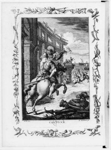 Astolphe en sonnant du cor met les Amazones en fuite, pour permettre à Guidon, à Marphise et à leurs amis de prendre la fuite en mer. Terrifiée par le son du cor, l’une des Amazones se jette à la mer du haut des remparts (st. 96), représentés ruinés à la manière des ruines de Pannini ou de Ricci.
