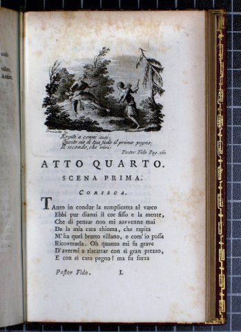 1. Signature sous la gravure à gauche : « Daniotto sc[ulpsit]. » Sous la signature, on peut lire : « Ergiti a cenni suoi. Questo sia di tua fede il primo pegno ; Il secondo, che vivi. Pastor Fido Pag. 162. »