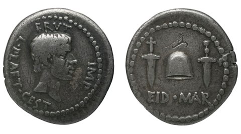 Au centre de la pièce, le pileus, bonnet porté par les esclaves affranchis, symbolise la liberté retrouvée. L'inscription EID(ibus) MAR(tiis) désigne les Ides de Mars, la date à laquelle César a été tué.