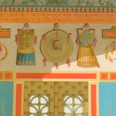 Dans ce dessin, qui fait voir la cella du côté de la porte, tout, à l'exception des dimensions et des porportions principales, est restitué d'après les errements puisés dans les textes des auteurs ancienns et les monuments helléniques. Les inscriptions, tant celles qui accompagnent les figures peintes sur le mur que celles placées sur les offrandes qui y sont suspendues, ne présentent qu'une réunion de lettres et n'ont d'autre objet que de donner une idée de l'usage des anciens d'inscrire le snoms des personnages à côté ou au-dessus des peintures qui les représentaient, comme, à côté de leurs offrandes ou au-dessus, l'objet de la consécration et les noms des donateurs. » (Hittorff, vol. 1, p. 760-1)