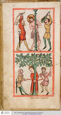 Flagellation du Christ. Achior attaché (Speculum Humanae salvationis, Hs-2505, F36v)