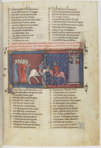 1. Rubrique : « Ci devise comment gauvain se combat contre giromelant devant le chastel perilleus enmi la praierie. et y estoit le roy arthus et la royne et une grant quantite de s agent avec lui. Et de l'autre partie une grant partie de la gent giromelant ».