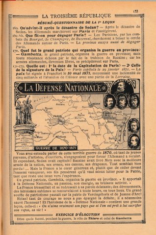 L'image reprend l'illustration du cours élémentaire de 1904, avec quelques modifications : le titre « La Défense nationale » est nouveau, la première version donnait simplement « Guerre de 1870-1871 ». L'Alsace et la Lorraine n'étaient pas hachurées comme territoire contesté, pas plus que le territoire allemand n'était grisé comme territoire ennemi. Gambetta ne figurait pas en médaillon au dessus de tous les autres. A la gauche de Bourbaki figurait en revanche Mac-Mahon, le premier président de la IIIe république.
