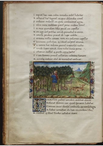 Corydon dans la hêtraie (Virgile, Bucoliques, 2e églogue, Escurial RBME S-II-19, f2v)