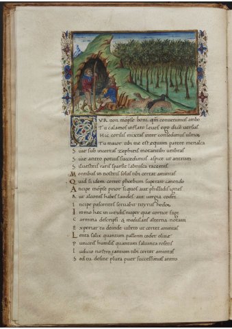 Mopsus et Ménalque (Virgile, Bucoliques, 5e églogue, Escurial RBME S-II-19, f7v)