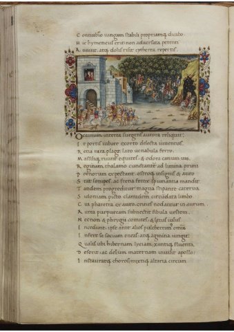 Didon et Énée partent à la chasse. L'orage (Virgile, Énéide, IV, Escurial RBME S-II-19, f95v)