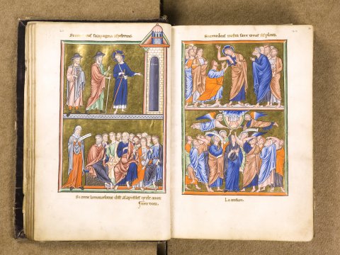 Sur la miniature inférieure, Marie-Madeleine annonce aux apôtres la résurrection du Christ.