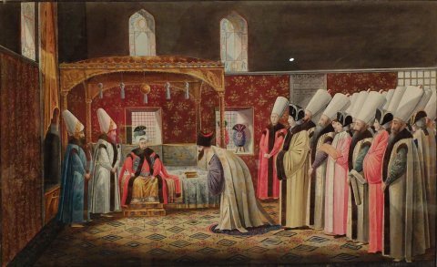 3. Pendant de RCIN 917142, qui représente la rencontre de l'ambassadeur avec le grand vizir, qui a eu lieu avant sa rencontre avec le sultan et pour laquelle l'ambassadeur portait un costume de cour anglais.