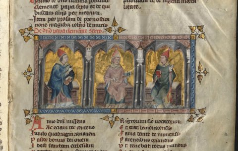 Le pape Clément VI s'installe en Avignon (Gilles li Muisis, Antiquitates Flandriae, KBR 3076-13077 f2r)