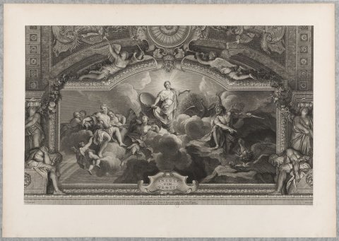 Sous les signatures : « Un des tableaux de la voûte de la grande Gallerie du Palais Royal. | A Paris chez L. Surugue Graveur du Roy rue des Noyers attenant le Magazin de Papier vis à vis St Yves A.P.D.R. »