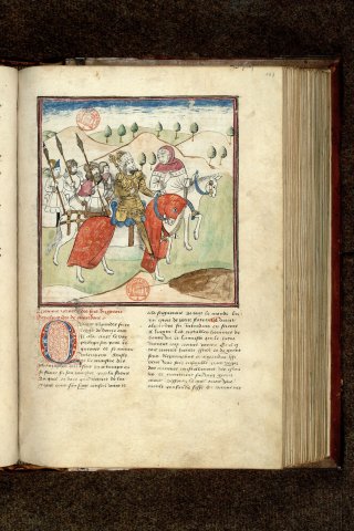 Aristote chevauchant avec Alexandre (La Fleur des histoires, Mazarine ms 1559, f143r)
