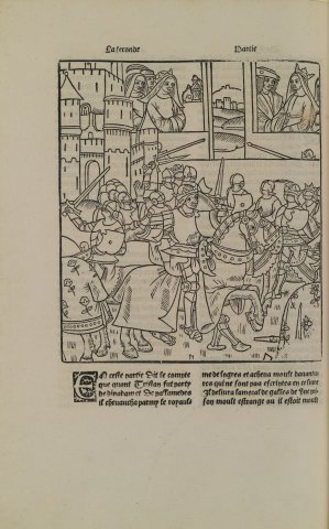Tristan au tournoi de la Roche Dure ? (Tristan, chevalier de la table ronde, éd. Vérard, 2e p., f.21v)