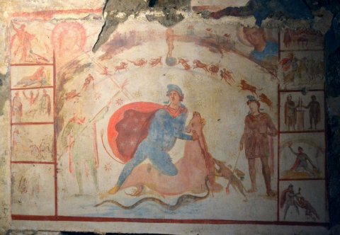 Au centre de la fresque, Mithra portant le bonnet phrygien saisit le taureau par ses narines et le tue en lui perforant l'artère jugulaire avec un poignard. Un serpent et un chien boivent le sang sui jaillit, tandis qu’un scorpion mord les testicules du taureau. En haut, la voûte céleste est figurée par les douze signes du zodiaque. Au centre de l’arc qu'ils forment, un dieu à tête de lion pose ses pieds sur un globe. Il est enveloppé dans les anneaux d’un serpent.