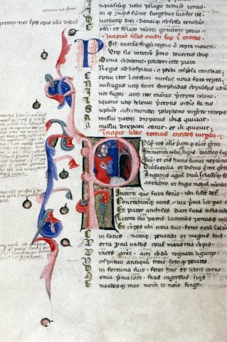 Énée quitte Troie en flammes, P historié du livre 3 (Énéide, Bodléienne, MS. Canon. Class. Lat. 52, f22v)