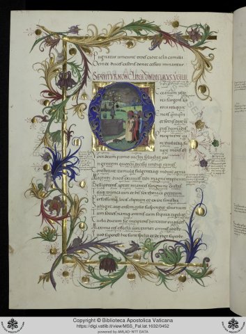 Le trophée de Mézence (Virgilii opera, Vatican, Pal.lat.1632, Énéide 11, f222v)