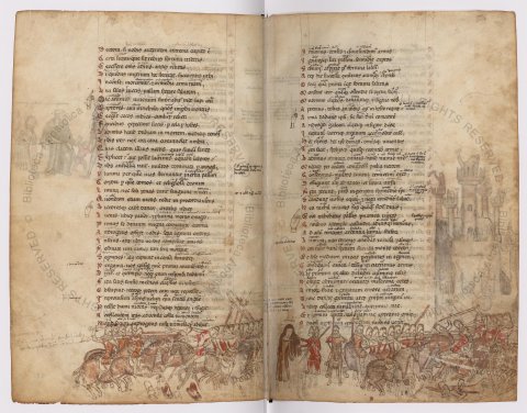 Les deux pages s'opposent : à gauche, Corèbe mène la contre-offensive troyenne ; ils ont revêtu les armes grecques et trompent l'ennemi. A droite, Cassandre est arrêté. Corèbe et les siens venus à son secours sont écrasés par les Grecs.