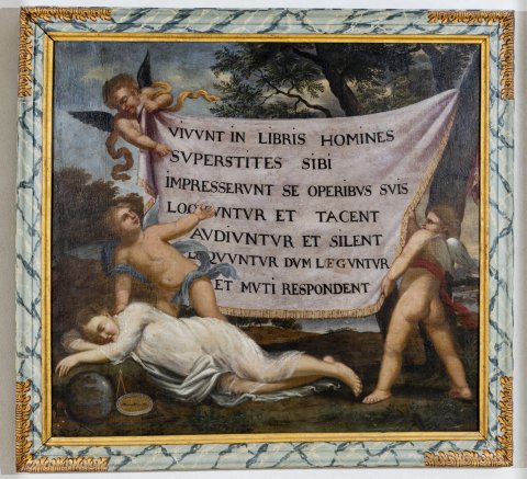 Le drap est tendu entre deux branches à droite et le putto d’en haut à gauche. Il déroule le texte d'un frontispice, qui pourrait être le frontispice de tout livre. Il faut se garder d'en surtraduire le texte latin, qui développe un paradoxe courant : les livres sont muets, et pourtant ils parlent. Il ne s'agit pas ici de célébrer l'immortalité que les écrivains s'acquièrent pas leurs livres (un seul possessif dans le texte latin, et aucune référence à la mort), mais de célébrer la lecture : une bibliothèque est un lieu silencieux, et pourtant il bruit de multiples paroles.