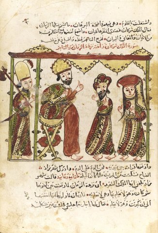 Le paysage assis à gauche sur un siège curule est le roi Umar an-Nu'mân. Il est assisté d'un garde, debout derrière lui. Les mains levées, il accueille son fils Sharr Kân et la fiancée de celui-ci, Abrîza. L'accueil se passe à l'intérieur du palais, comme l'indiquent les pieds nus des personnages.