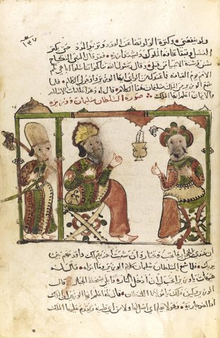Daw' al-Makân est représenté à gauche assis sur un siège curule et flanqué d'un garde. En face de lui à droite, le vizir Dandân a revêtu le vêtement d'honneur par lequel le roi vient de le confirmer dans ses fonctions. Il a quasiment le même vêtement que Daw' al-Makân et est également assis sur un siège curule : seul son turban multicolore diffère de la coiffe d'or du roi.