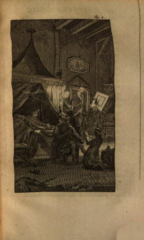 Sur l’image, les compagnons d’Axminster viennent d’enfoncer la porte de la demeure et lui ont laissé la liberté d’interroger son rival. Visibles au second plan, ils observent la scène représentée au premier plan : Axminster est assis, Aberdeen est à genoux devant lui et implore sa grâce, tandis que l’épouse d’Axminster est encore dans le lit. Bien qu’elle soit parfaitement innocente, Axminster, fou de rage, la transperce par la suite de plusieurs coups d’épée.