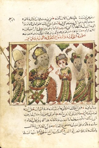 A gauche, vêtu d'une coiffe d'or, assis sur un siège curule, flanqué d'un garde, se tient le roi Sulaymân Shah. Au centre, un personnage de sexe indéterminé : c'est 'Azîz, qui dans une précédente aventure a été émasculé. Derrière lui se tient le vizir, qui porte une plume à son turban. C'est la 2e personne à qui s'adresse le roi, qui le charge de mener à bien toute l'affaire. Effacé tout à droite, c'est Tâj al-Mulûk, mentionné en 3e, qui se retire dans ses appartements.