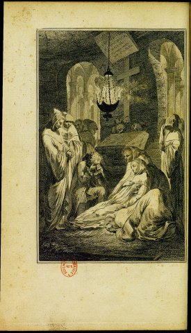 Adélaïde, déguisée en moine pour suivre son ami le comte de Comminge dans l'abbaye de la Trappe, meurt entouré de celui-ci, du chevalier d'Orvigni – en habits séculiers – du père abbé, et de tous les moines de l'abbaye qui ressemblent plutôt à des fantômes à cause de leurs coules blanches qui recouvrent leurs visages. Au fond, les hautes colonnes indiquent que les personnages se trouvent dans le souterrain de l'abbaye, plus particulièrement à l'endroit où, chaque jour, les moines creusent littéralement leur fosse afin d'y être enterrés à leur mort.