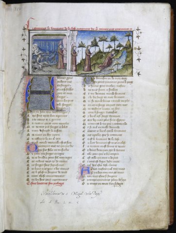 Songe de l'amant. Il s'arrête devant une rivière (Le Roman de la rose, Valence BH Ms. 387, f.2r)