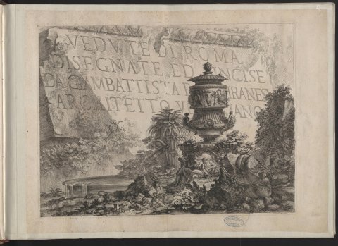 Piranèse, qui n'est plus architecte vénitien, mais s'est installé à Rome pour produire ces vedute, signe encore « Architetto veneto », mais dissimule « veneto » derrière une urne !