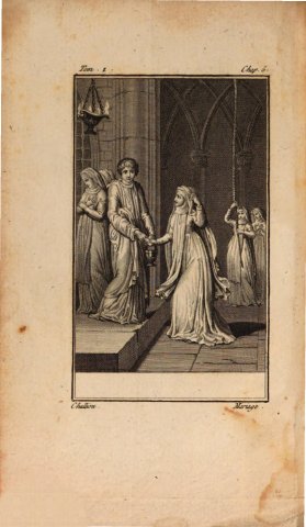 C’est cette scène que la gravure représente : Lauretta et Alphonse échangent un regard tendre et se comprennent sans s'être jamais parlés. Profitant de cet instant furtif, Alphonse lui glisse discrètement sa lettre, tandis qu’autour d’eux les religieuses et les autres novices sont occupées à prier.