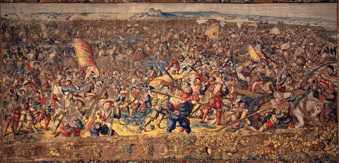 Défaite de la cavalerie française. Les fantassins impériaux s'emparent de l'artillerie ennemie (Tenture de la bataille de Pavie) - Van Orley et Dermoyen