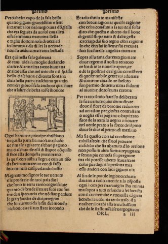 Argaïl et sa sœur Angélique se présentent devant Charles (Orlando innamorato, Venise, G. de Rusconi, 1513, a3r))