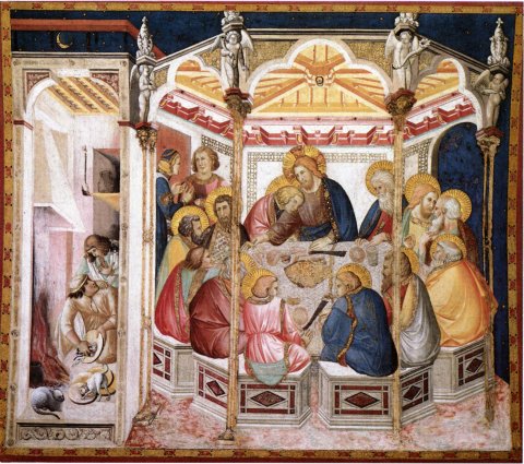 L’originalité de cette Cène consiste dans la scène de genre représentée à gauche, où les domestiques donnent les reliefs du banquet à manger au chat et au chien. D’autre part, même si la table est rectangulaire, la représentation des apôtres assis en rond, et non étirés autour d’une longue table rectangulaire, s’inscrit encore dans la tradition de l’icône byzantine, où la table est ronde parce que l’autel de l’église orthodoxe est rond. Judas à gauche (reconnaissable à l’absence d’auréole) étire son bras vers la table pour prendre le pain que lui tend le Christ. Cette attitude est intermédiaire entre la tradition byzantine, où Judas parmi les apôtres tend la main vers la table, et la tradition occidentale, où le Christ tend l’hostie à Judas, placé à l’écart des autres disciples.