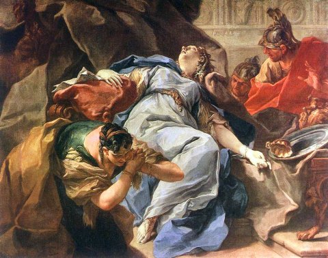 Sophonisbe, princesse carthaginoise, a été mariée de force à Massinissa roi de Numidie. Massinissa lui avait cependant juré qu’elle ne serait contrainte à la soumission aux Romains. Scipion cependant (sans doute en haut à droite ?) fait arrêter Sophonisbe. Massinissa lui fait parvenir une coupe empoisonnée (à droite sur le plateau chancelant), que Sophonisbe boit en déclarant « qu’il lui aurait été plus facile de mourir si elle n’avait pas eu à se marier pour ses funérailles ».