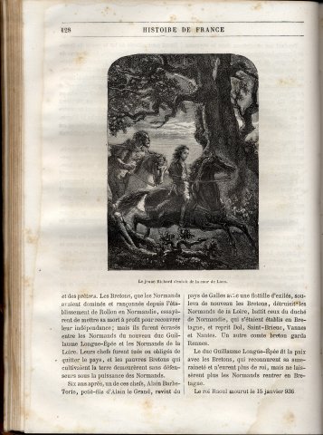 « Le roi Louis d’Outre-Mer réclama la tutelle du petit duc Richard, fils de Guillaume Longue-Épée, qui n’avait que dix ans, afin de disposer sous son nom des ressources de la Normandie. Ce fut ce duc qu’on appela Richard Sans-Peur. Le roi l’emmena en France, et promit de venger la mort de Guillaume Longue-Épée sur le comte de Flandre. Mais le roi ne tint point parole. Il fit la paix avec le comte de Flandre, qui lui promit de le soutenir, et il projeta de prendre pour lui la Normandie, sous prétexte que le petit duc était bâtard, étant né d’un mariage contracté à la manière danoise, et non selon la loi chrétienne. Le petit duc était gardé à vue, par ordre du roi, dans le château de Laon. Son gouverneur l’enveloppa d’une botte de foin, l’emporta sur son dos, et parvint à s’échapper avec lui. Le roi avait promis au duc de France sa part de la Normandie, puis ne voulut plus la lui donner.