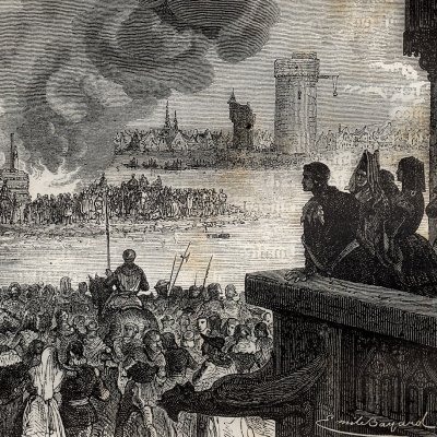 Les commissaires du pape, ne sachant que faire, s’ajournèrent au lendemain. Mais, à la nuit tombante, le roi fit conduire le grand maître et son compagnon dans une petite île de la Seine située à l’ouest de la Cité, et, là , il les fit brûler ensemble, sans qu’ils eussent été condamnés par aucun juge.