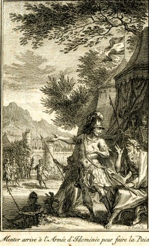 Légende sous la gravure : « Mentor arrive à l'Armée d'Idoménée pour faire la Paix ».